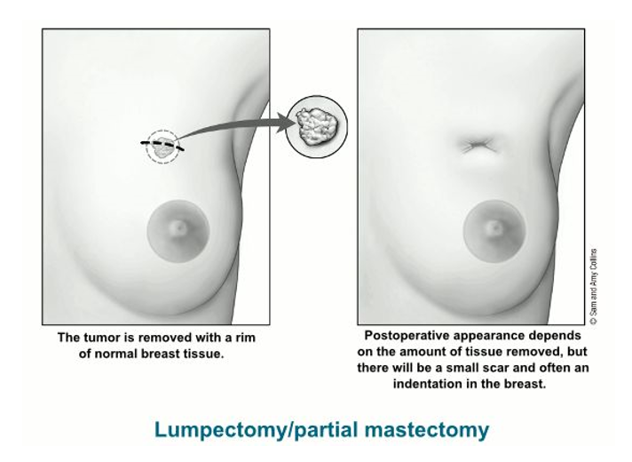 Breast-conserving surgery (BCS) removes the cancer while leaving as much normal breast as possible. Usually, some surrounding healthy tissue and lymph nodes also are removed. Breast-conserving surgery is sometimes called lumpectomy, quadrantectomy, partial mastectomy, or segmental mastectomy depending on how much tissue is removed.