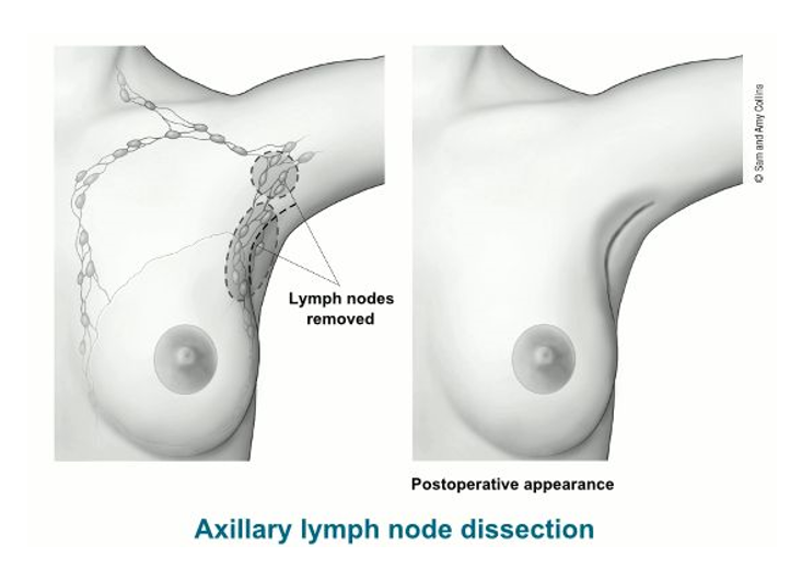 In this procedure, anywhere from about 10 to 40 (though usually less than 20) lymph nodes are removed from the area under the arm (axilla) and checked for cancer spread. ALND is usually done at the same time as a mastectomy or breast-conserving surgery (BCS), but it can be done in a second operation.
