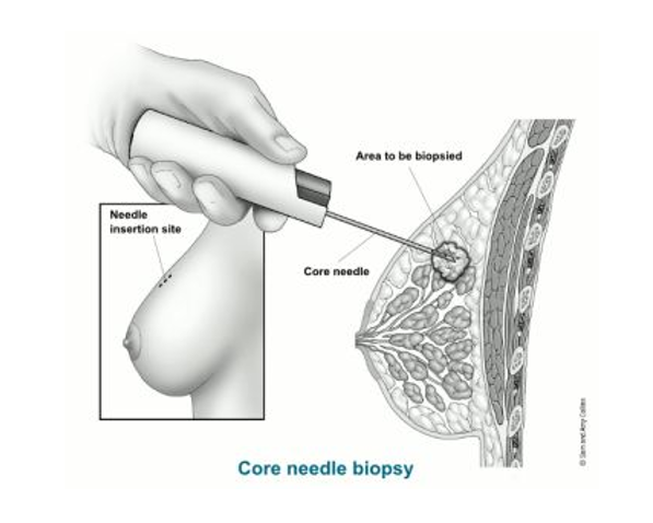 A breast core biopsy is a procedure to remove a sample of breast tissue for testing. The tissue sample is sent to a lab, where doctors who specialize in analyzing blood and body tissue (pathologists) examine the tissue sample and provide a diagnosis.